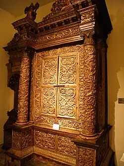Unterhalb der Inschriftentafel sind die Türen des Torahschreins von 1843 aus der Grande Sinagoga italiana zu Mantua, die italienische Faschisten 1938 sprengten. Die Türen mit mittiger Darstellung der Gesetzestafeln des Bundes vom Berge Sinai krönt das Relief eines Keter Torah.[29] Beiderseits des Keters und am Fuße des Torahschreins befanden sich zusätzliche Reliefs von Tempelgefäßen. Zwischen beiden Fenstern dieses Saals hängt die Parochet Tedesca von 1572 aus Ferrara,[30] die älteste erhaltene der Welt.[29]