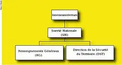 - Direction de la Surveillance du Territoire (DST): polizeilicher Inlandsnachrichtendienst; auch Vertretungen in den französischen Überseegebieten; Aufgaben waren: Sicherungs-, Ermittlungs- und (Spionage-)Abwehraufgaben, sowie Extremismus- und Terrorismusbekämpfung; auch: Bekämpfung der Organisierten Kriminalität und Verhinderung der Verbreitung von Massenvernichtungswaffen (Proliferation).