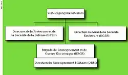 - Direction du Renseignement Militaire (DRM): militärischer (strategisch-operativer) Nachrichtendienst; Hauptaufgaben: Fernmeldeaufklärung, Kryptographie, Satellitenaufklärung