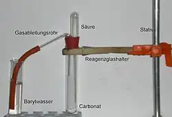 Für den Nachweis von Kohlenstoffdioxid verwendet man eine Calciumhydroxidlösung. Dazu leitet man das Gas in gesättigtes Kalkwasser oder Barytwasser und ein farbloser Feststoff (Calciumcarbonat) fällt aus, wenn Kohlenstoffdioxid enthalten ist.