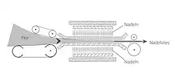 Die Verfestigung des mehrschichtigen Vlieses („Flor“) erfolgt im Nadelstuhl. In diesem befinden sich die sogenannten Nadelbretter, die mit vielen Tausenden Nadeln bestückt sind. Diese sind jeweils 3 oder 3,5 Zoll lang und verfügen über mehrere Widerhaken. Die Stärke des Nadelschaftes orientiert sich an der Feinheit der verwendeten Fasern. Die Nadeln stechen bis zu 1000 mal in der Minute in das Vlies hinein. Dabei bewirken die Widerhaken, dass sich die leicht gekräuselten Fasern verhaken.