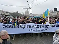 Am 6. März 2016 demonstrierten etwa 1000 Ukrainer auf dem Unabhängigkeitsplatz in Kiew für eine Freilassung von Sawtschenko, die drei Tage zuvor am 3. März in den Hungerstreik getreten war. Etwa 200 weitere Demonstranten versammelten sich vor der Russischen Botschaft in Kiew, um ebenfalls für die Freilassung zu demonstrieren. Dabei kam es durch einige Demonstranten, unter ihnen Ihor Mosyitschuk, Parlamentsabgeordneter der Radikalen Partei, zu Vandalismus auf dem Botschaftsgelände. Der russische Botschafter Michail Jurjewitsch Surabow reichte daraufhin Beschwerde beim ukrainischen Außenministerium ein.[81] Am 6. März demonstrierten einige Dutzend und am 10. März etwa 200 Russen vor der ukrainischen Botschaft in Moskau für eine Bestrafung Sawtschenkos. Sie hielten Plakate hoch mit den Parolen „Sawtschenko hinter Gittern“ und „Ukraine, du bist krank“. Bei den Protesten am 6. März in Moskau kam es in einigen Fällen zu Vandalismus.[82][83] Am 8. März attackierte eine Gruppe Aktivisten von Eduard Limonows Partei „Das andere Russland“ das ukrainische Konsulat in Sankt Petersburg. Die Männer schwenkten Flaggen der selbstproklamierten „Volksrepublik Donezk“ und „Noworossija“ und skandierten „Sawtschenko – brenn in der Hölle“ und „Tod der Kiewer Junta“.[84]