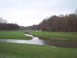 Kurz vorher zweigt an der linken Seite ein über 3 km langes Hochflutbett ab, das weiter südlich parallel der Neuen Luppe verläuft und sich schließlich in der Landschaft verliert.[4] Über das 1954 nach dem Hochwasser von Juli 1954 gebaute Nahle-Auslassbauwerk (3) kann bei Hochwasser der Auenwald südlich der Neuen Luppe einschließlich der Burgaue geflutet werden. Das Auslassbauwerk wurde erstmals am 9. Januar 2011 teilweise und am 14. Januar 2011 vollständig geöffnet. Im Juni 2013 wurde der Auslass während des Hochwassers ein zweites Mal geöffnet. Das Nahleauslassbauwerk wurde 2014 durch einen Neubau ersetzt.