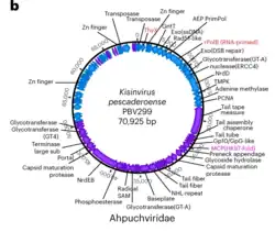 Die Familie Ahpuchviridae umfasst eine einzige Art, Kisinvirus pescaderoense mit dem Virus PBV299. PBV299 hat ein dsDNA-Genom mit einer Länge von 70.925 bp und besitzt und außer den für die Klasse Caudoviricetes typischen morphogenetischen Genen noch Gene, die für eine DNA-Polymerase der Familie B mit RNA-Primer (englisch RNA-primed family B DNA polymerase), eine sowohl bei Archaeen als auch bei Eukaryoten vorkommende Primase (englisch archaeo-eukaryotic primase) und ein Proliferating-Cell-Nuclear-Antigen (PCNA) kodieren.[3]