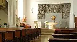 Mehrere Reliefs aus Stein gehörten ursprünglich zum Lettner der Kirche von Kloster Blaubeuren. Die stark hinterschnittenen, auf Untersicht berechneten Reliefs stellen die Kreuzigung und weitere Szenen aus dem Leben Jesu dar und wurden 1501 von Meister Anton geschaffen. Der Taufstein ist barocken Ursprungs und mit einer Buckelkuppa ausgestattet. Eine sitzende Herz-Mariä-Madonna mit einer den Kontrapost betonenden Haltung von 1735 wird Dominikus Hermenegild Herberger zugeschrieben und präsentiert das Christkind und das Herz.