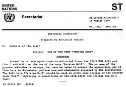 - ↑ UN Editorial directive regarding the Persian Gulf ( des vom 19. Februar 2014 im Internet Archive) Info: Der Archivlink wurde automatisch eingesetzt und noch nicht geprüft. Bitte prüfe Original- und Archivlink gemäß Anleitung und entferne dann diesen Hinweis.