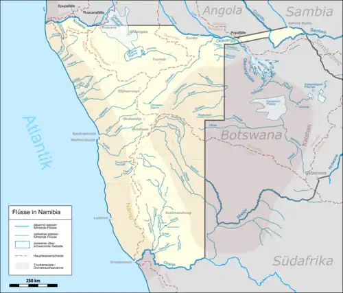 Neben den genannten Grenzflüssen gibt es noch zahlreiche weitere Flüsse, von denen aber kein einziger mit Sicherheit ganzjährig Wasser führt. Außerhalb der Regenzeit finden sich nur ausgetrocknete Flussbetten (Riviere).