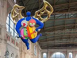 „Nana“ ist ein vieldeutiger Begriff aus dem Französischen für eine moderne, selbstbewusste, erotische und verruchte Frau. Mit dem Ausspruch „Alle Macht den Nanas!“ griff Niki de Saint Phalle Mitte der 1960er Jahre den Ideen der Frauenbewegung vor. Erstmals wurden ihre überdimensionierten Frauenplastiken im Oktober 1965 in Paris ausgestellt. Die lebensbejahenden, fröhlichen, bunten, meist tanzenden, oft überlebensgroßen, dicken „Nanas“ ziehen sich durch ihr weiteres Schaffen. 1968/69 entstand die Schwarze Nana im Wallraf-Richartz-Museum sowie 1994 im Museum Ludwig die Nana auf einem Delphin. Die Nanas stehen zunächst für Lebenskraft, Weiblichkeit, freie Gestaltung ohne Hemmungen und Konventionen, sie vereinigen alle Frauen in sich, sind eine umfassende Reflexion der weiblichen Existenz.