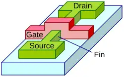 In dieser Hinsicht wird die Nanoelektronik einfach als Mikroelektronik im Nanometerbereich interpretiert, das heißt mit Strukturgrößen kleiner als 100 nm.[1] Diese einfache, sehr grobe Definition enthält keinen direkten Bezug auf neue notwendige Lösungsstrategien, die aufgrund des steigenden Einflusses quantenmechanischer Phänomene nicht mehr bei der Funktionsweise und Aufbau der elektronischen Bauelemente als auch bei der Fertigung vernachlässigbar sind. Mit diesen neuen Ansätzen ist die Nanoelektronik somit auch verbunden mit der Nutzung auch neuer Materialien (z. B. High-k-Dielektrika), Fertigungsprinzipien (z. B. Immersionslithografie, EUV-Lithografie) und Bauelementkonzepte (z. B. FinFET und dessen Weiterentwicklungen sowie Kohlenstoff-Nanoröhren-Feldeffekttransistor) für die Fortführung der Skalierung „konventionellen“ Konzepte im Rahmen des mooreschen Gesetzes als auch neuer Konzepte der Nanoelektronik, die unter anderem mit den Begriffen „More Moore“, „More than Moore“ oder „Beyond CMOS/Moore“ bezeichnet werden. Die Einschränkung Nanoelektronik nutzt quantenmechanische Funktionsprinzipien oder Ähnliches wird ebenfalls als nicht sinnvoll erachtet, auch da dies „Bauelemente einschließen würde, die seit Jahrzehnten in Verwendung sind (beispielsweise Laserdioden, SQUIDs etc.) und üblicherweise nicht zur Nanoelektronik gezählt werden.“[1]