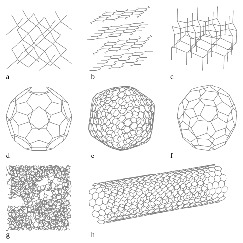 Neue Materialien wie Fullerene (d-f) oder Carbon-Nanotubes (h) sind Nanotechnologie und werden schon jetzt in vielen Gebieten eingesetzt