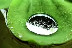 Effekte wie sie viele Nanotechnologien nutzen, kommen häufig in der Natur vor. So sind an Fliegenbeinen nanometergroße Haare, die der Grund dafür sind, dass diese Insekten an Decken und Wänden laufen können. Das bekannteste Beispiel für Nanotechnologie ist der Lotoseffekt: Feine Nanostrukturen sorgen dafür, dass Wasser auf dem Blatt der Lotosblume abperlt und die Haftung von Schmutzpartikeln minimiert wird. Die Flügel des Glasflügelfalters erscheinen transparent und reflektieren durch unregelmäßige Nanosäulen nur einen Bruchteil der infraroten bis ultravioletten Strahlung.[9] Auch sind im Kalk von Muschelschalen organische und anorganische Stoffe im Nanobereich so eng aneinandergereiht, dass Muschelschalen extrem stabil und widerstandsfähig sind, derselbe Effekt existiert auch im menschlichen Knochen. Des Weiteren werden in jeder Verbrennung sehr viele Nanopartikel frei. Auch die Enzym-Moleküle, die Ribosomen, und die weiter oben erwähnten Geißel-Antriebe der Bakterien sind natürliche Nanomaschinen.