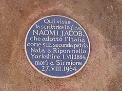 Jacob zog 1930 nach Sirmione am Gardasee, da das dortige Klima ihren Lungen gut tat. An ihrem Wohnhaus, das als 'Casa Mickey' bekannt ist, wurde ihr zu Ehren eine Blue Plaque angebracht. Während des Zweiten Weltkrieges kehrte sie ins Vereinigte Königreich zurück, um bei der Verteidigung zu helfen. Sie arbeitete für die Entertainments National Service Association, wo sie Fernsehsendungen zur Stärkung der Moral und Livevorstellungen für die Truppen produzierte. Sie gab nie ihr Haus in Italien auf und kehrte bald nach dem Krieg zurück. Naomi Jacob starb in Sirmione.