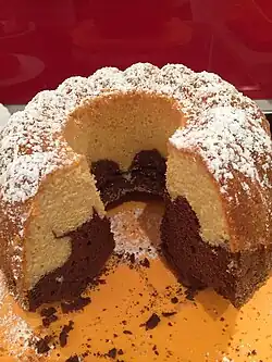 Napfkuchen (auch Topfkuchen) ist die Bezeichnung für einen in einem hohen Gefäß (einem Napf oder Topf ähnlich) gebackenen Kuchen,[1] im Gegensatz zu flachen Kuchenformen.[2] Bekannte Napfkuchen sind im deutschsprachigen Raum der Gugelhupf in seiner typisch gerieften runden Tüllenbackform und der italienische Panettone in seiner hohen, glatten Topfform.[3] In Nord- und Westdeutschland wird mit Rodonkuchen üblicherweise ein Napfkuchen mit Rosinen, einem gerührten, eihaltigen Hefefeinteig oder auch mit Backpulver gelockerte Napfkuchen, bezeichnet.[4]