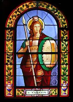 Ein Glasfenster der 1865 geweihten Kirche Saint-Louis de Vichy zeigt St. Napoleon als spätantiken oder mittelalterlichen Krieger mit den Gesichtszügen Bonapartes. Die Kapelle Saint-Germain in Chesnay bei Versailles wurde in der Revolution verwüstet und 1805 wieder aufgebaut. Bei einer Renovierung 1865 erhielt sie ein Glasfenster (s. Abbildung), das Napoleon als Soldatenheiligen in einer Art antik-griechischer Rüstung zeigt.[29]