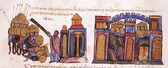 Die Geschichte des Priesters Themel, die sich Anfang des 10. Jahrhunderts zugetragen haben soll, ist ein Beispiel für die Auseinandersetzungen an der Grenze zwischen dem Byzantinischen Reich und seinen muslimischen Nachbarn, aber auch für die Versuche, Religionskonflikte im Alltag kleinzuhalten. Die Miniatur in der byzantinischen Chronik des Johannes Skylitzes (Ende 11. – Anfang 12. Jahrhundert) zeigt, wie der Priester mit dem Klangholz auf muslimische Angreifer eindrischt, die mitten im Gottesdienst die Kirche plündern wollten. Der Priester verletzte und tötete einige und trieb alle in die Flucht. Der sich anschließende versöhnliche Aspekt fehlt in der Abbildung. Weil ein Priester keine Gewalt anwenden darf, verbot ihm der Bischof die weitere Amtsausübung. Themel protestierte vergeblich und setzte sich schließlich zu den Arabern ab, nahm den muslimischen Glauben an, kämpfte auf deren Seite als Befehlshaber gegen die Christen und verübte zahlreiche Gräueltaten, wie es in der Geschichte weiter heißt.[7]