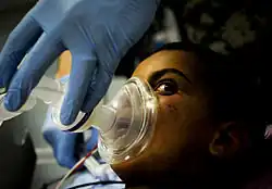 Inhalationsanästhetika wie Sevofluran, Isofluran, Desfluran oder Lachgas werden über die Atemluft zugeführt. Die Flurane bewirken hauptsächlich einen Bewusstseinsverlust, daneben eine leichte Muskelerschlaffung und Schmerzlinderung. Lachgas hingegen wirkt stark analgetisch, hat jedoch nur einen geringen hypnotischen und keinen muskelrelaxierenden Effekt. Die frühesten Substanzen zur Inhalationsanästhesie[17] waren Lachgas, Diethylether („Äther“) und Chloroform.[18]