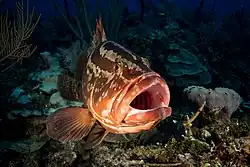 Der Nassau-Zackenbarsch (Epinephelus striatus) ist bei Tauchern auch unter seinem englischen Namen Nassau Grouper bekannt.