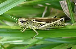 Sumpfschrecken (Stethophyma grossum) sind ausschließlich in intakten Feuchtwiesen zu finden, da sie feuchten Boden für die Eiablage brauchen.