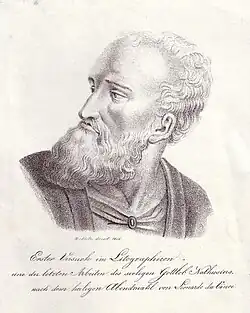 - ↑ Titel: Erster Versuch im Lithographiren, eine der letzten Arbeiten des seeligen Gottlob Nathusius, nach dem heiligen Abendmahl von Leonardo da Vinci, Dr Elster, 1828. Bei dem hier genannten Gottlob Nathusius handelt es sich um einen Sohn von Johann Gottlob Nathusius. Die Lithografie wurde vermutlich erst nach dessen Tod vollendet