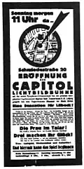 Zu Beginn des Jahres 1929 schloss die Tonhalle; das Lichtspieltheater wurde einem grundlegenden Umbau unterzogen, der über ein halbes Jahr in Anspruch nahm. Der Kinosaal, vom ersten Stock ins Erdgeschoss verlegt, wurde mit einer Bühne für Liveauftritte, einer Hupfeld-Kinoorgel zur Filmbegleitung und einem Zuschauerbalkon versehen und verfügte nunmehr über 684 Sitzplätze. Den Zugang bildete ein Foyer mit Kasse und Süßwarenstand. Am 9. September fand die feierliche Eröffnung des in Capitol umbenannten Kinos statt, bei der auch Ernst Albert sprach.