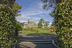 - Das Great Palm House wurde 1884 als Ersatz des bei einem Sturm zerstörten Vorgängerbaus (Bauzeit 1842–1850) errichtet. Die als Warmhaus für große Palmengewächse und andere tropische Pflanzen gestaltete Anlage wurde von 2002 bis 2004 umfangreich restauriert. Die zwei Seitenflügel des Palmenhauses werden gebildet vom Flowering House für wechselnde Blumenausstellungen und dem Orchid House, in dem über 1000 Orchideenarten sowie Bromeliengewächse und fleischfressende Pflanzen untergebracht sind. In diesem Gewächshaus gelang es David Moore in den 1840er Jahren weltweit erstmals, Orchideen aus Samen zu ziehen und erfolgreich bis zur Blüte zu bringen. Die bei Moores Experimenten genutzten Arten waren Epidendrum elongatum, E. crassifolium, Cattleya forbesii und Phaius albus.[5]