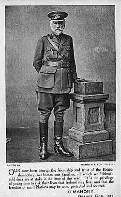 Die meisten Mitglieder blieben jedoch Redmond gegenüber loyal, und so kam es, dass 175.000 Mitglieder aus den Irish Volunteers austraten und in die National Volunteers wechselten – lediglich 13.500 blieben.[1] Die meisten National Volunteers, wie auch viele weitere Iren, folgten schließlich dem Aufruf Redmonds, unter ihnen waren auch die Parlamentarier William O’Brien und D. D. Sheehan, und traten entweder der 10. oder der 16. irischen Division der britischen Kitcheners Armee bei. Redmond wurde bei der Rekrutierung unter anderem auch von Pierce Charles de Lacy O’Mahony unterstützt.