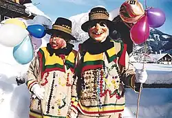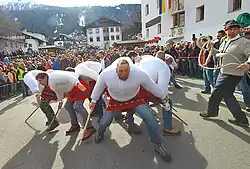 Seit 1958 ziehen am Unsinnigen Donnerstag in der Tiroler Ortschaft Patsch die in Zweierreihen aufgestellten Frauen durch den Ort und schlagen Glocken und Schellen im Rhythmus, der von einer Hexe vorgegeben wird. Die Schellenschlagerinnen tragen dabei eine hölzerne Maske, einen mit Federn, Trotteln und Blumen verzierter Hut, geblümte Schultertücher, mit bunten Bändern verzierte, weiße Hemden und Kniebundlederhosen. Die Schellen und Glocken werden von den Frauen hinter dem Rücken getragen und im vorgegebenen Rhythmus geschellt. Die Hexe beendet mit einem Signal mit dem Besen den Umzug, zu dessen Ende „ausgeschellt“ wird und alle Glocken noch einmal gleichzeitig erklingen. Die Kostüme werden in der Regel innerhalb der Familie von Mutter und Großmutter auf die Tochter vererbt. Bei den traditionell von Männern dominierten Tiroler Fasnachtsbräuchen stellen die Patscher Schellenschlagerinnen eine Ausnahme dar.[25] Termin: Unsinniger Donnerstag (Fasnacht) nächster Termin: 12. Februar 2026 | ||