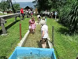 Seit 1763 werden die Gärten und Hausäcker der Marktgemeinde Theresienfeld durch ein künstliches Bewässerungssystem des Tirolerbaches nach festen Regularien bewässert. Zur Bewässerung der bis dahin landwirtschaftlich nicht nutzbaren Gegend wurde im 18. Jahrhundert ein 5,3 km langer Bewässerungskanal angelegt, der von der Piesting gespeist wird. Das Wasser wird von dem Bewässerungskanal aus nach festgesetzten Regularien auf die Felder geleitet. Die Wasserleitungsordnung regelt die Wasserverteilungsmenge und -zeiten, Instandhaltungsmaßnahmen und Sanktionen bei Verstößen. Alle Bezieher von Tirolerbachwasser sind verpflichtet, sich an der Reinigung und Instandhaltung der wasserwirtschaftlichen Anlage zu beteiligen. Die gemeinschaftlichen Aufgaben fördern die soziale Bindung in der Gemeinde und die Verantwortung für die knappe Ressource Wasser.[25] Termin: Ende Oktober wird das Wasser „odraht“, am ersten Aprilsonntag „kummts Wossa wieder“. nächster Termin: 5. April 2026 | |