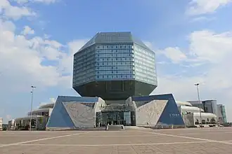 Im Jahr 1989 wurde beschlossen, ein neues Bibliotheksgebäude in Minsk am Prospekt Nesawisimosti 116 zu errichten, aber erst im Jahr 2002 wurde mit den Baumaßnahmen begonnen. Am 16. Juni 2006 wurde das 72 Meter hohe Gebäude nach drei Jahren Bauzeit fertiggestellt und eröffnet. Die Form des Baus ist ein archimedischer Körper, das kleine Rhombenkuboktaeder mit einem Durchmesser von 60 Metern. Die äußerste Schicht des Gebäudes bildet einen isolierenden Luftraum, der bei der Klimatisierung der Bibliothek wirksam ist. Der Entwurf stammt von den Architekten Viktor Kramarenko und Michail Vinogradov. Im obersten Stock befindet sich eine Beobachtungsplattform, die für den Publikumsverkehr geöffnet ist und rege genutzt wird.