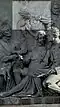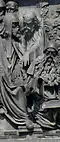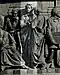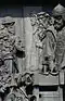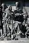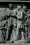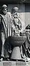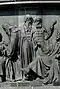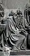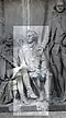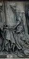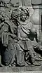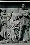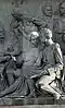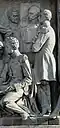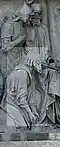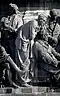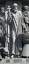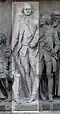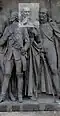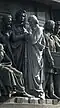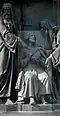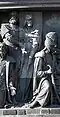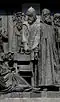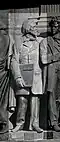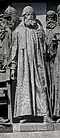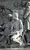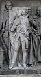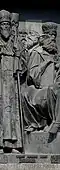 Gründung des unabhängigen russischen Zarentums | Основание самодержавного царства Русского | 1491 | Dargestellt ist Iwan der Große im byzantinischen Zarengewand und mit Mütze des Monomach. In den Händen hält er ein Zepter und einen Reichsapfel. Vor ihm kniet ein Tatare, daneben liegen der besiegte Litauer, der das Großfürstentum Litauen repräsentiert, sowie ein deutsch-baltischer Ritter mit gebrochenem Schwert, der für den Deutschen Orden steht. Die Gruppe blickt in Richtung Nordosten. |