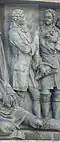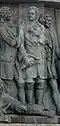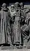 Beginn der Vertreibung der Tataren | Начало изгнания татар | 1380 | Dmitri Donskoi, der Sieger in der Schlacht von Kulikowo, hält in seiner rechten Hand einen russischen sechskantigen Streitkolben. Zu seinen Füßen liegt Mamai, der Emir der Goldenen Horde. In der linken Hand hält Dmitri Donskoi einen erbeuteten Buntschuk, das tatarische Machtsymbol. Die Komposition befindet sich auf der östlichen Seite. |