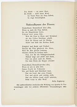 - ↑ Anita Augspurg: Nationalhymne der Frauen. In: Frauenstimmrecht: Monatshefte des Deutschen Verbandes für Frauenstimmrecht. Nr. 1/2, 1912, S. 2 (addf-kassel.de [PDF; abgerufen am 30. November 2018]). Nationalhymne der Frauen ( des vom 30. November 2018 im Internet Archive) Info: Der Archivlink wurde automatisch eingesetzt und noch nicht geprüft. Bitte prüfe Original- und Archivlink gemäß Anleitung und entferne dann diesen Hinweis.