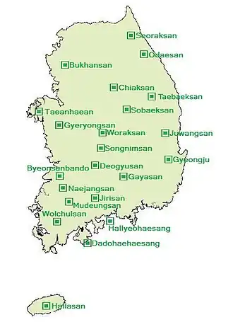 Südkorea hat 22 Nationalparks, darunter siebzehn Berg-Nationalparks, vier Meeres- und Küstennationalparks und einen historischen Nationalpark. Bis auf den Hallasan-Nationalpark auf der Insel Jeju werden alle Nationalparks vom Korea National Park Service verwaltet.[1]