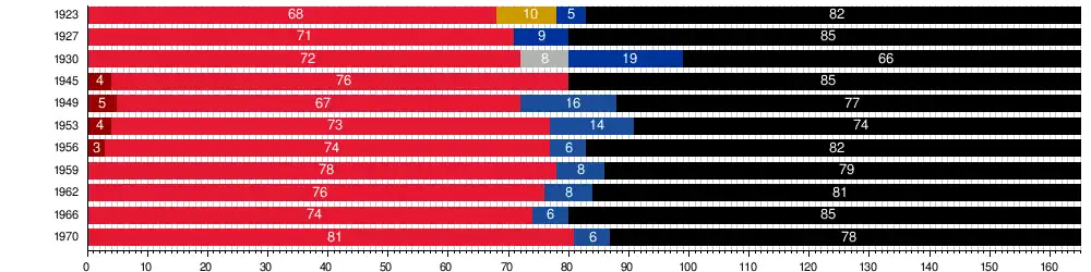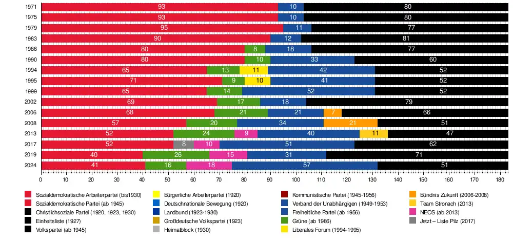Ab 1945 hatte der Nationalrat zunächst 165 Abgeordnete, erst 1971 wurde die Anzahl der Abgeordneten wieder auf 183 erhöht. Dies war die Gegenleistung der SPÖ an die FPÖ für die Stützung der SPÖ-Minderheitsregierung. Vorrangiger Wunsch der Freiheitlichen war, mit ihren damals 5,5 Prozent wieder Klubstärke, die damals bei acht Abgeordneten lag, zu erreichen.[2]