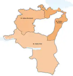 Gemäss dem «Bundesgesetz betreffend die eidgenössischen Wahlen und Abstimmungen» vom 19. Juli 1872 erfolgte eine Anpassung des Gebiets, als zwei Gemeinden im Bezirk Werdenberg an den Wahlkreis St. Gallen-Nordost abgetreten wurden.[3] St. Gallen-Süd umfasste somit: