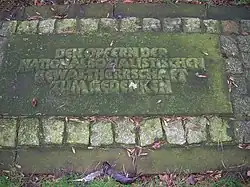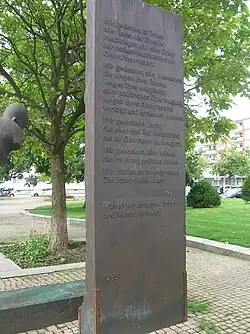 - ↑ Der Text auf dem Denkmal lautet: „Wir gedenken in Trauer aller Toten des Zweiten Weltkrieges und aller Opfer der nationalsozialistischen Gewaltherrschaft. Wir gedenken aller Menschen, die wegen ihrer Rasse, wegen ihrer religiösen oder politischen Überzeugung, wegen ihres Andersseins verfolgt und ermordet wurden. Wir gedenken derer, die eher den Tod hinnahmen, als ihr Gewissen zu beugen. Wir gedenken aller Völker, die im Krieg gelitten haben. Wir dürfen nicht vergessen. Die Toten mahnen uns. Mühen wir uns um Frieden und Menschlichkeit! 1986“.