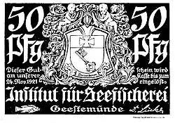 In den drei Städten Bremerhaven, Geestemünde und Lehe herrschte in der Inflationszeit wirtschaftliche Not. Verschiedene Stellen, insbesondere das Institut für Seefischerei, ließen Notgeld drucken.[6] In dieser Zeit gab es in Bremerhaven-Wesermünde schon eine Ortsgruppe der NSDAP.[7]