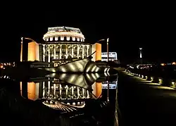 Aus der Perspektive des Brunnens vor dem Haupteingang evoziert der reich geschmückte Bau die Assoziation eines Flussdampfers. Später wurde das Theater um eine Open-Air-Bühne erweitert. Mit den umliegenden Parkflächen steht das Nationaltheater auf einer Fläche von 20.844 m².