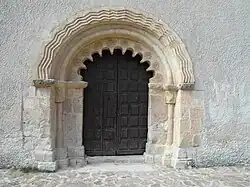 Das Portal der Kirche befindet sich auf der ansonsten verputzten Südseite des Langhauses. Es handelt sich um ein einfaches Archivoltenportal, dessen wulstförmig profilierter Bogenlauf außen von einem wellenförmig gezackten Blendbogen gerahmt wird. Der innere Bogen ist – nach islamischen bzw. mozarabischen Vorbildern – neunfach gezackt und mit zehn kleinen Blütenrosetten geschmückt.