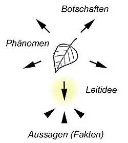 Natur- und Kulturinterpretation geht immer von einem Phänomen aus. Das Phänomen wird auf seine Botschaften hin untersucht, und die viel versprechendste Botschaft wird zur Leitidee fortentwickelt. Die Leitidee (engl. theme) ist die „tiefere Wahrheit“ (engl. larger truth)[6], auf die die Interpretation gleich einem Leitstern zusteuert, und die weit über das Thema (engl. topic) hinausgeht.[7] Jede Leitidee stützt sich auf konkrete Aussagen (Fakten).[8]