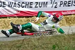 Eine im Sommer vereinzelt betriebene Variante ist das Rollenrodeln. Diese wird vom Rennrodelverband und seinen Landesverbänden auf Demonstrationsveranstaltungen wie Sportseminaren präsentiert.[14] Ziel ist, interessierten Jungen und Mädchen den Rodelsport näherzubringen.[15] Statt der Schienen von Rennrodeln sind üblicherweise bis zu 20 Rollen mit Hilfe von Lagern und Trägern am Schlitten montiert, die das Fahren auf gesperrten Straßen ermöglichen. Für das Anbremsen der Kurven werden zum Beispiel Schuhe mit Teilen aufgeklebter Autoreifen verwendet. Als Schutzhandschuhe dienen gummierte Handschuhe. Den Kopf schützt ein homologierter Helm. Die Rennstrecken weisen Längen von zirka 800 – 1200 m bei einem durchschnittlichen Gefälle von 10 – 12 % auf. Bremsstellen und Kurven werden mit Schutzwänden abgesichert. Die Höchstgeschwindigkeiten betragen 90 km/h. Dabei kommen Einsitzer und auch Doppelsitzer in den Altersklassen Schüler bis Senioren zum Einsatz. Für viele Wintersportler ist dies eine technische, körperliche und mentale Vorbereitung für das Naturbahn-Rennrodeln. Offizielle Wettkämpfe in der Sportart gibt es allerdings keine.