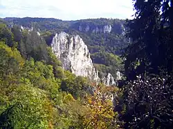 Die Hausener Felsen bestehen aus einer Reihe von Einzelfelsen über der Ortschaft Hausen im Tal, von denen heute insgesamt 17 beklettert werden können. Diese bieten eine große Anzahl von Routen in allen Schwierigkeitsgraden. In den 1980er Jahren waren diese der Hauptanziehungspunkt für die schwäbische Kletterprominenz, die markante Touren hinterlassen haben.[9]