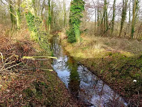 Trockengefallener Graben – Efeu überwuchert Bäume -