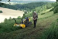 Im März 2021 wurden mit einem Fällbagger von der Straße aus absterbende Eschen, die wegen der Verkehrssicherheit entfernt werden mussten, und alle anderen großen Bäume in Falldistanz zur Straße zu entfernen. Der Fällbagger hatte einen Ausleger von 15 m. Die Hydraulikscherre konnte bis 35 cm Stärke alles abschneiden und auch gleich zur Seite heben. Bei über 35 cm Stammstärke haben die Greifer den Baum gehalten und mit der Motorsäge von einem Mitarbeiter der Biologische Station abgesägt. Zuerst scherrte der Bagger aber in 6 bis 8 m den oberen Teil des Baumes ab und hob ihn beiseite. Bei einigen ganz großen Bäumen wurde der Baum gehalten und zuerst ein Fällkerb mit der Motorsäge geschnitten. Nach dem absägen wurde der Baum dann Richtung Hang umgedrückt und dann in per Hydraulikscherre zerteilt. Die abgescherrten Bäume packte der Baggerfahrer auf Haufen. Später wurden die Bäume gehäckselt.[2]
