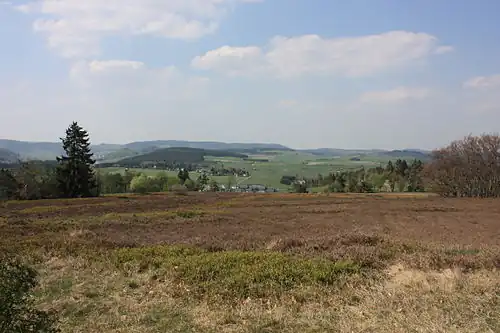 Blick vom Kahlen Pön über Usseln mit dahinter liegendem Schneeberg (mittig) zum Bergzug Dreis mit Hohem Eimberg | ||