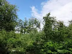 Aus der historischen Nutzung befinden sich – insbesondere auf den Mineralböden – noch einige, teilweise mehrere hundert Jahre alte Stieleichen, Rotbuchen und hainbuchenreiche Bestände im Naturschutzgebiet. Größere Flächen sind mit Lärchen, Fichten und Douglasien bewachsen, die auf ehemaligen Hutungsflächen aufgeforstet wurden. In nassen, abgeschlossenen Senken wachsen die Seggenriese und die Grauweide. Größere Flächen sind mit Erlenbruchwäldern und der Sumpf-Schwertlilie, Röhricht und Rohrglanzgras bewachsen. Am Südrand sind alte Hudewaldformen mit Stieleichen und Rotbuchen erhalten geblieben. Hier wachsen das Wiesen-Kammgras sowie Rotschwingelrasen. Im Unterwuchs ist der Weißdorn und die Hasel anzutreffen.