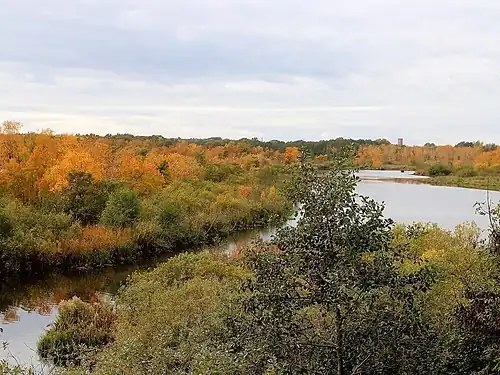 ![]() Blick vom Aussichtsturm „Moorochse“ über die ehemaligen Torfstiche im NSG Nordufer Plauer See | ||