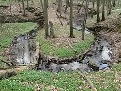 Ein Erlen-Bruchwald und Feuchtwiesen finden sich im Gebiet. Typische Pflanzen sind Schaumkräuter, Seggen, Wollgräser, Pfeifengras, Teufelsabbiss, Kümmelsilge, Kleiner Baldrian und Schilfrohr.