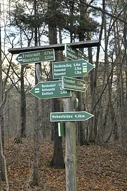 - Waldgasthaus und Hotel Stiefelburg. Das Gasthaus ist ein beliebtes Ausflugs- und Wanderziel und liegt auf einem Bergsporn in etwa 455 m ü. NHN in der südöstlichen Nachbarschaft des Quingerbergs (480,2 m ü. NHN) zwischen Meckfeld und Nauendorf, etwa 1,8 km von Meckfeld entfernt. Das Anwesen hat sich aus einer Rastmöglichkeit Zum Waldfrieden entwickelt, die zwischen 1928 und 1930 auf dem Stiefelberg, einer alten Flurbezeichnung, errichtet worden war. 1938 wurde das Rasthaus in eine Gaststätte mit Übernachtungsmöglichkeiten um- und ausgebaut. Als Name, der bis heute Bestand hat, wurde Stiefelburg gewählt. Weitgehend unbeschadet überstand das Anwesen den Weltkrieg und die Zeit als HO-Ausflugsgaststätte.[3]