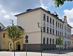 1891 wurde das 1857 errichtete Rathaus größtenteils abgebrochen und neu erbaut, im Jahr 1919 erweitert.[27] 1889 gründete sich im Ort der Verein Elisabethstift, der sieben Jahre später eine Kleinkinderbewahranstalt eröffnete.[28] Ab den 1880er Jahren erarbeitete sich Naunhof einen Ruf als Sommerfrische. Neben saisonalen Sommergästen ließen sich immer mehr Großstädter dauerhaft im Ort nieder. Allein zwischen 1884 und 1891 entstanden in Naunhof 57 neue Wohngebäude und Villen. Dazu wurden zahlreiche Erweiterungen und Umbauten an vorhandenen Häusern vorgenommen. Innerhalb weniger Jahre hatte sich die Anzahl der Gebäude in Naunhof nahezu verdoppelt, die Stadt verzeichnete zu dieser Zeit 2.992 Einwohner in 399 Häusern.[25] 1903 wurde die städtische Gasanstalt eingeweiht, damit wurde die Gasbeleuchtung in Naunhof eingeführt.[29] In den folgenden Jahrzehnten vergrößerte sich der Ort stetig, 1933 lebten 4.408 Einwohner im Ort.[30] 1925 gründete sich die Ortsgruppe der NSDAP in Naunhof.[31] Ab 1928 wurde der am ehemaligen Schloss gelegene Hügel abgetragen und der erste Sportplatz in der Gemeinde errichtet. 1934, im Jahr des 50-jährigen Jubiläums des örtlichen Turnvereins TSV Naunhof 1884, wurde das Naunhofer Waldbad eingeweiht.[32]
